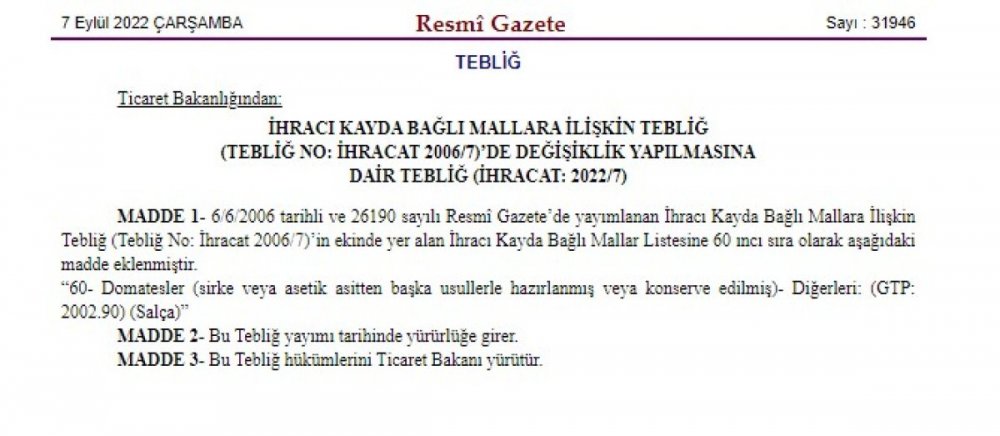 Ticaret Bakanlığı tarafından hazırlanan İhracı Kayda Bağlı Mallara İlişkin Tebliğ'de Değişiklik Yapılmasına Dair Tebliğ, Resmi Gazete'de yayınlanarak yürürlüğe girdi. Tebliğle ihracı kayda bağlı mallar listesine domates de eklendi.