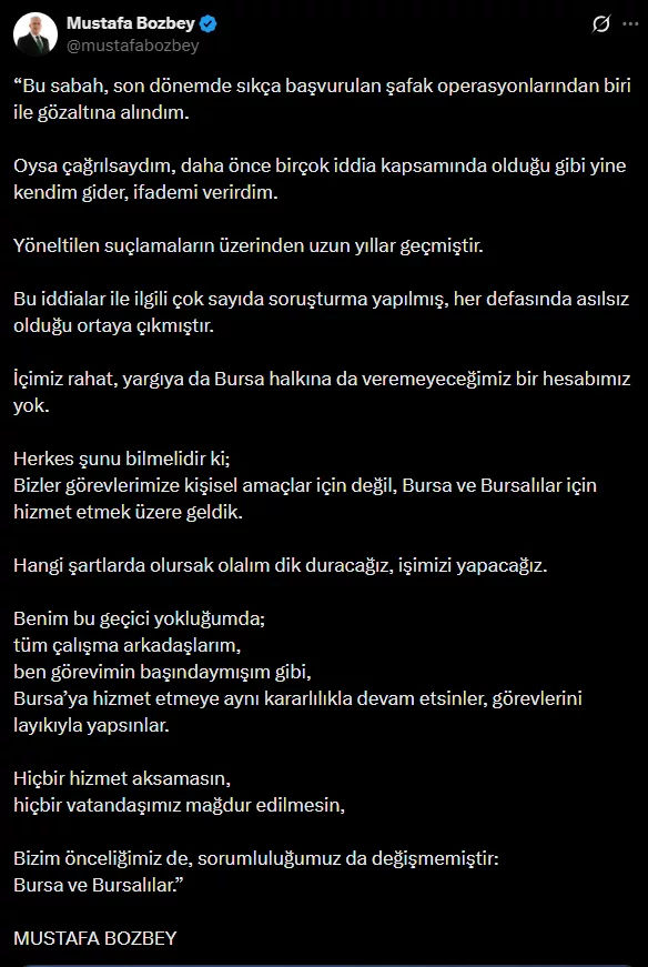 "Bu sabah, son dönemde sıkça başvurulan şafak operasyonlarından biri ile gözaltına alındım. Oysa çağrılsaydım, daha önce birçok iddia kapsamında olduğu gibi yine kendim gider, ifademi verirdim. Yöneltilen suçlamaların üzerinden uzun yıllar geçmiştir. Bu iddialar ile ilgili çok sayıda soruşturma yapılmış, her defasında asılsız olduğu ortaya çıkmıştır. İçimiz rahat, yargıya da Bursa halkına da veremeyeceğimiz bir hesabımız yok. Herkes şunu bilmelidir ki; Bizler görevlerimize kişisel amaçlar için değil, Bursa ve Bursalılar için hizmet etmek üzere geldik. Hangi şartlarda olursak olalım dik duracağız, işimizi yapacağız. Benim bu geçici yokluğumda; tüm çalışma arkadaşlarım, ben görevimin başındaymışım gibi, Bursa'ya hizmet etmeye aynı kararlılıkla devam etsinler, görevlerini layıkıyla yapsınlar. Hiçbir hizmet aksamasın, hiçbir vatandaşımız mağdur edilmesin, Bizim önceliğimiz de, sorumluluğumuz da değişmemiştir: Bursa ve Bursalılar."